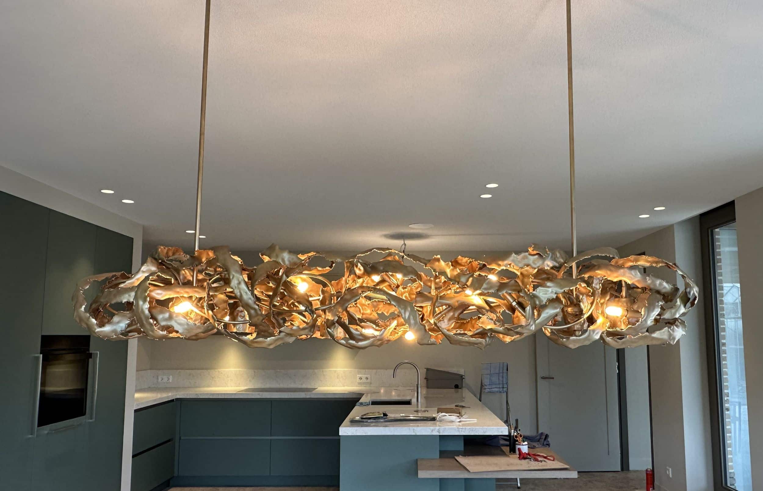 Aangepaste afmetingen zijn mogelijk. Lamp wordt op de juiste hoogte gehangen door middel van een buis of ketting. Mogelijk is ook aan 2 buizen/ lichtpunten. Bij bestelling graag plafondhoogte en gewenste onderkant lamp doorgeven. Afwerking: Nikkel, gepareld nikkel, Koper, Rose, Brons, Champagne of Zwart