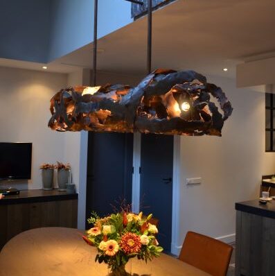 Aangepaste afmetingen zijn mogelijk. Lamp wordt op de juiste hoogte gehangen door middel van een buis of ketting. Mogelijk is ook aan 2 buizen/ lichtpunten. Bij bestelling graag plafondhoogte en gewenste onderkant lamp doorgeven. Afwerking: Nikkel, gepareld nikkel, Koper, Rose, Brons, Champagne of Zwart