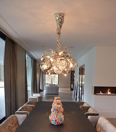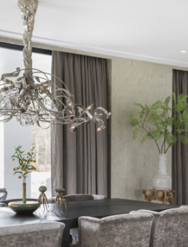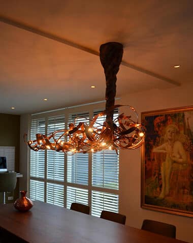 Aangepaste afmetingen zijn mogelijk. Deze lamp hangt aan meerdere buizen omkleed zodat de stam van deze lamp lijkt op een boomstam. De onderkant lamp is dus niet verstelbaar. Bij bestelling graag plafondhoogte en gewenste onderkant lamp doorgeven. Afwerking: Nikkel, gepareld nikkel, Koper, Rose, Brons, Champagne of Zwart